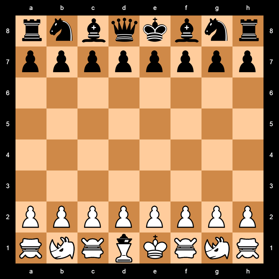 In this asymetric game black has a classic set, white leads a new army where everyone has been replaced except the king and the pawns.